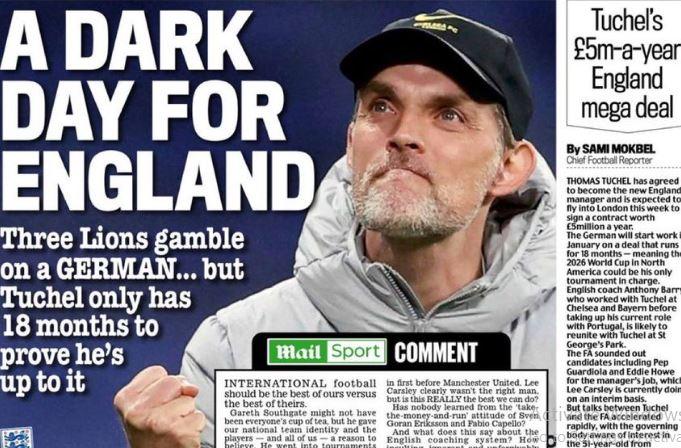 Σκληρή κριτική από την εφημερίδα Daily Mail στην απόφαση της Ποδοσφαιρικής Ομοσπονδίας της Αγγλίας να προσλάβει τον Τόμας Τούχελ στην εθνική ομάδα της χώρας.