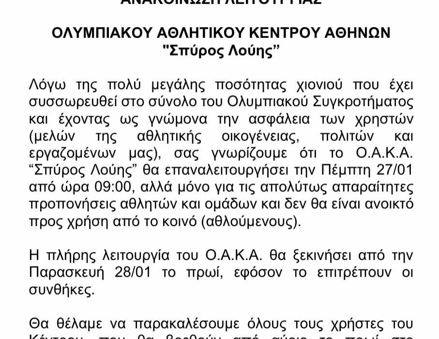 Λόγω της μεγάλης ποσότητας χιονιού εντός του γηπέδου, το ΟΑΚΑ θα λειτουργήσει την Πέμπτη (27/01) μόνο για προπονήσεις αθλητών και ομάδων, ενώ θα λειτουργήσει πλήρως ξανά την Παρασκευή 28/01.