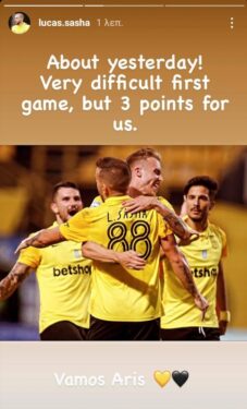 Ο Βραζιλιάνος χαφ του Άρη δημοσίευσε στιγμιότυπο του ματς της Παρασκευής αναφέροντας πως ήταν ένα δύσκολο παιχνίδι για τον Άρη, αλλά πως ο σημαντικό ήταν οι τρείς πρώτοι βαθμοί.