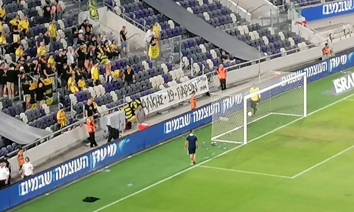 Οι οπαδοί του Άρη έχουν πάρει την θέση τους στην εξέδρα και εκεί υπάρχει πανό για τον Άλκη. “Άλκης 19 παρών”, γράφει, με τους φίλους των “κιτρίνων που είναι στο Τελ Αβίβ, να κάνουν ειδική αναφορά στον αδικοχαμένο νεαρό που δολοφονήθηκε από οπαδούς του ΠΑΟΚ.