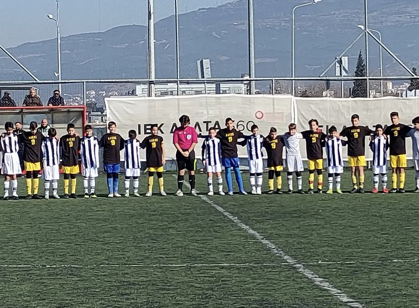 Αγκαλιασμένα σύσσωμα, τα παιδιά του Άρη και του ΠΑΟΚ σε αγώνα της Κ13 κρατούν ενός λεπτού σιγή στη μνήμη του Άλκη.