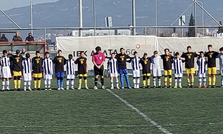 Αγκαλιασμένα σύσσωμα, τα παιδιά του Άρη και του ΠΑΟΚ σε αγώνα της Κ13 κρατούν ενός λεπτού σιγή στη μνήμη του Άλκη.