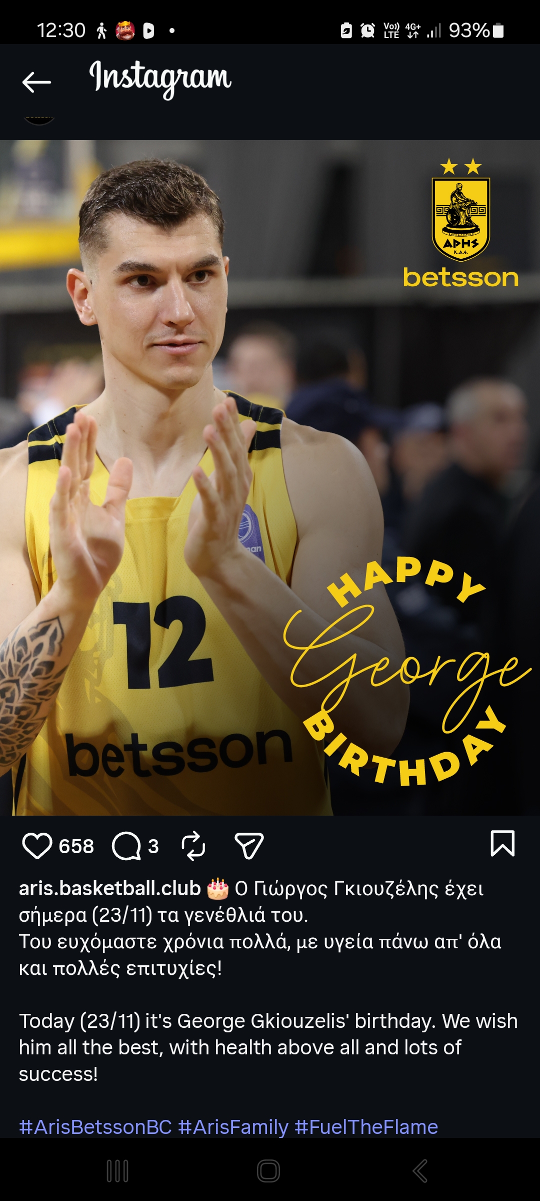 Η ΚΑΕ Άρης Betsson του έστειλε τις ευχές της.