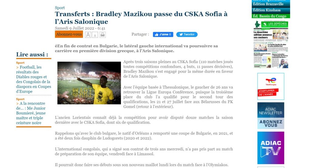 Με τη μεταγραφή του 26χρονου ποδοσφαιριστή, ασχολούνται σήμερα (9/7) στην πατρίδα του, το Κονγκό, με την ιστοσελίδα adiac-congo να φιλοξενεί σχετικό ρεπορτάζ, στο οποίο μεταξύ άλλων αναφέρονται τα εξής: