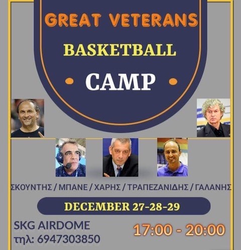 “Το 1ο GREAT VETERANS BASKETBALL CAMP προσκαλεί κάθε βετεράνο αθλητή του μπάσκετ να συμμετέχει παίζοντας, συζητώντας και μαθαίνοντας ρετρό και ανέκδοτες ιστορίες του μπάσκετ, από διακεκριμένους αθλητές, coaches και δημοσιογράφους! Το πρόγραμμα θα λάβει χώρα στις 27, 28 και 29 Δεκεμβρίου, στις εξαιρετικές εγκαταστάσεις του SKG AIRDOME και περιλαμβάνει: