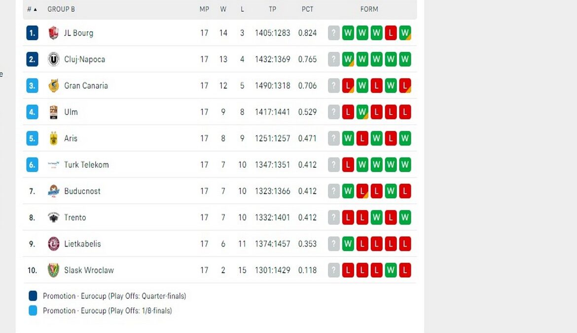 Αποστολή εξετελέσθη… Ο Άρης τελείωσε με το θέμα της πρόκρισης και πλέον είναι ανοιχτό το ενδεχόμενο να κατακτήσει την τέταρτη θέση στον όμιλο. Αυτό, μπορεί να γίνει αν κερδίσει την τελευταία αγωνιστική την Τρέντο στο Παλέ και η Ουλμ χάσει από την Μπουργκ, στη Γαλλία. Στο παιχνίδι που έληξε μετά τα μεσάνυχτα, η Κλουζ κέρδισε εκτός έδρας την Γκραν Κανάρια με 111-113 μετά από δυο παρατάσεις.