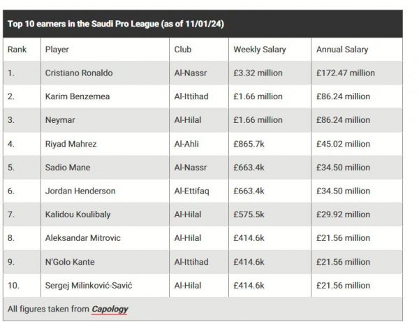 Συμβόλαια που έχουν ντύσει με χρυσούς μανδύες τους παραπάνω ποδοσφαιριστές, με τον Κριστιάνο Ρονάλντο να έχει σπάσει όλα τα κοντέρ και να αμείβεται από την Αλ Νασρ με σχεδόν με 3.5 εκατ. λίρες την εβδομάδα…