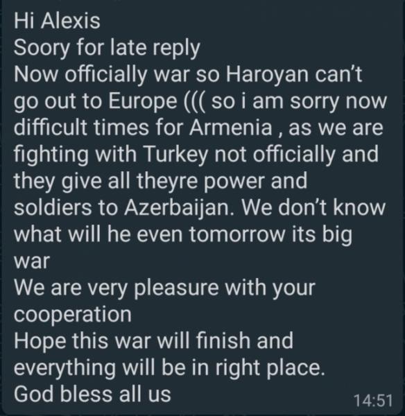 Όπως αναφέρει η ανακοίνωση της ΑΕΛ, ο κεντρικός αμυντικός δεν θα καταφέρει να γίνει κάτοικος Λάρισας αυτή τη μεταγραφική περίοδο καθώς οι Αρμένιοι πολίτες έως 40 ετών βρίσκονται στο πεδίο των μαχών μετά τις εντάσεις ανάμεσα σε Αζερμπαϊτζάν και Αρμενίας που έχει οδηγήσει σε σύρραξη.