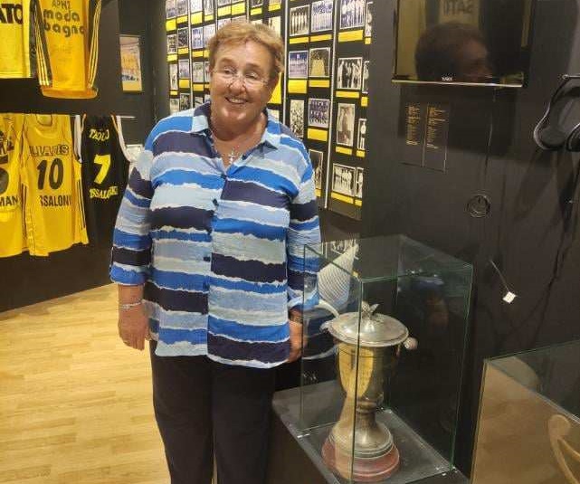 Η συνέχεια δόθηκε στο Αλεξάνδρειο Μέλαθρο. Εκεί έτυχε της υποδοχής του προέδρου της ΚΑΕ, του σπουδαίου Χάρη Παπαγεωργίου. Η ξενάγηση ξεκίνησε στο «Nick Galis Hall» και κατέληξε στο μέρος που πρέπει να καταλήγουν τέτοιες αναδρομές, στο μουσείο μπάσκετ του ΑΡΗ, τον ιερό χώρο με τα τρόπαια της ναυαρχίδας του συλλόγου. Πρώτο στη σειρά είναι το τρόπαιο του 1930 και η κυρία Αζνίβ με περισσή συγκίνηση πόζαρε δίπλα του και βγήκε φωτογραφίες που θα δείχνει με περηφάνια στα εγγόνια της πίσω στις ΗΠΑ. Φυσικά της δόθηκε και η φανέλα του Αυτοκράτορα, με τον πατέρα της να φιγουράρει στη φωτογραφία των πρώτων πρωταθλητών στο άθλημα αυτό!