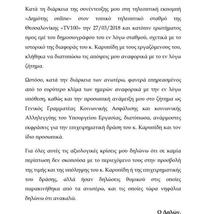 Μέσω γραπτής του δήλωσης, ο Ανδρέας Νεφελούδης ανακάλεσε το ό,τι είχε πει εναντίον του Καρυπίδη το 2018.