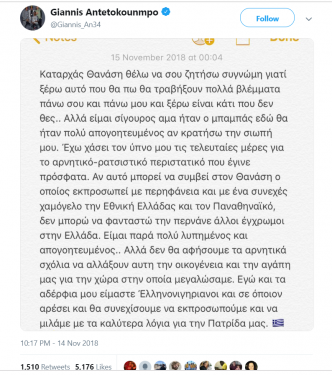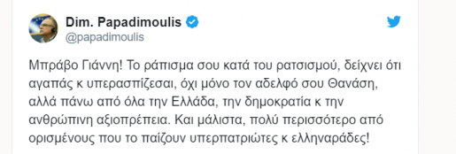 Μπράβο Γιάννη! Το ράπισμα σου κατά του ρατσισμού, δείχνει ότι αγαπάς κ υπερασπίζεσαι, όχι μόνο τον αδελφό σου Θανάση, αλλά πάνω από όλα την Ελλάδα, την δημοκρατία κ την ανθρώπινη αξιοπρέπεια. Και μάλιστα, πολύ περισσότερο από ορισμένους που το παίζουν υπερπατριώτες κ ελληναράδες!