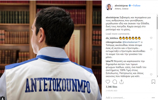 Στην συνέχεια πήρε θέση και ο Πρωθυπουργός, Αλέξης Τσίπρας, με δημόσια ανάρτηση φωτογραφίας με φανέλα του Αντετοκούνμπο, στο προσωπικό του twitter, επισημαίνοντας: