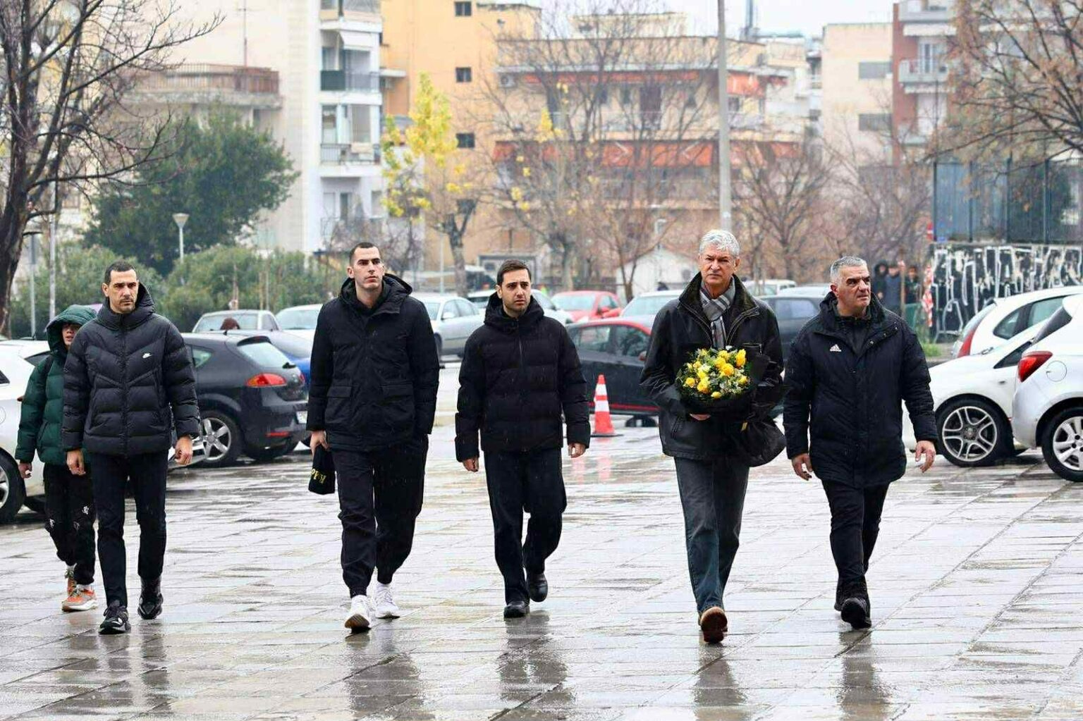 Ο πρόεδρος της ΚΑΕ, Χάρης Παπαγεωργίου, ο επιχειρησιακός διευθυντής, Βύρων Αντωνιάδης, ο General Manager, Νίκος Ζήσης, ο αρχηγός της ομάδας, Λευτέρης Μποχωρίδης και ο υπεύθυνος ασφαλείας, Λευτέρης Τσιλιγγόπουλος, βρέθηκαν στο γήπεδο της Τούμπας και άφησαν μία φανέλα του Άρη και λουλούδια, τιμώντας τη μνήμη των φιλάθλων που τόσο άδικα έφυγαν από τη ζωή, στο δρόμο για να υποστηρίξουν την ομάδα τους.