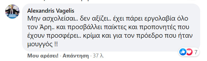 Ο Βαγγέλης Αλεξανδρής απάντησε: «Μην ασχολείσαι, δεν αξίζει.. έχει πάρει εργολαβία όλο τον Άρη και προσβάλλει παίκτες και προπονητές που έχουν προσφέρει.. κρίμα και για τον πρόεδρο που ήταν μουγγός.