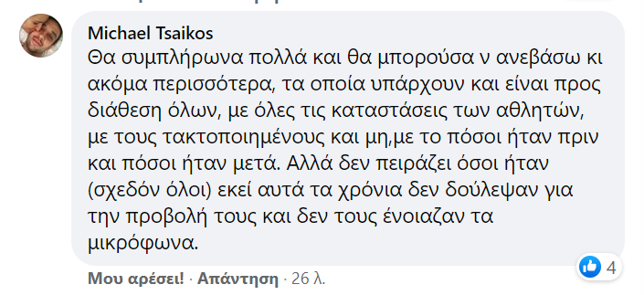 Ενώ ο επί χρόνια προπονητής του παιδικού του Άρη, Μιχάλης Τσάικος, ανέφερε: «Θα συμπλήρωνα πολλά και θα μπορούσα να ανεβάσω κι ακόμα περισσότερα, τα οποία υπάρχουν και είναι προς διάθεση όλων, με όλες τις καταστάσεις των αθλητών, με τους τακτοποιημένους και με, με το πόσοι ήταν πριν και πόσοι ήταν μετά. Αλλά δεν πειράζει, όσοι ήταν (σχεδόν όλοι) εκεί αυτά τα χρόνια δεν δούλεψαν για την προβολή του και δεν τους ένοιαζαν τα μικρόφωνα.