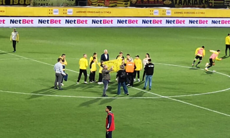 Στο ημίχρονο του αγώνα στο «Κλεάνθης Βικελίδης», οι πρωταθλητές πυγμαχίας του Άρη και ο Πέτρος Κωνσταντινούδης αποθεώθηκαν.