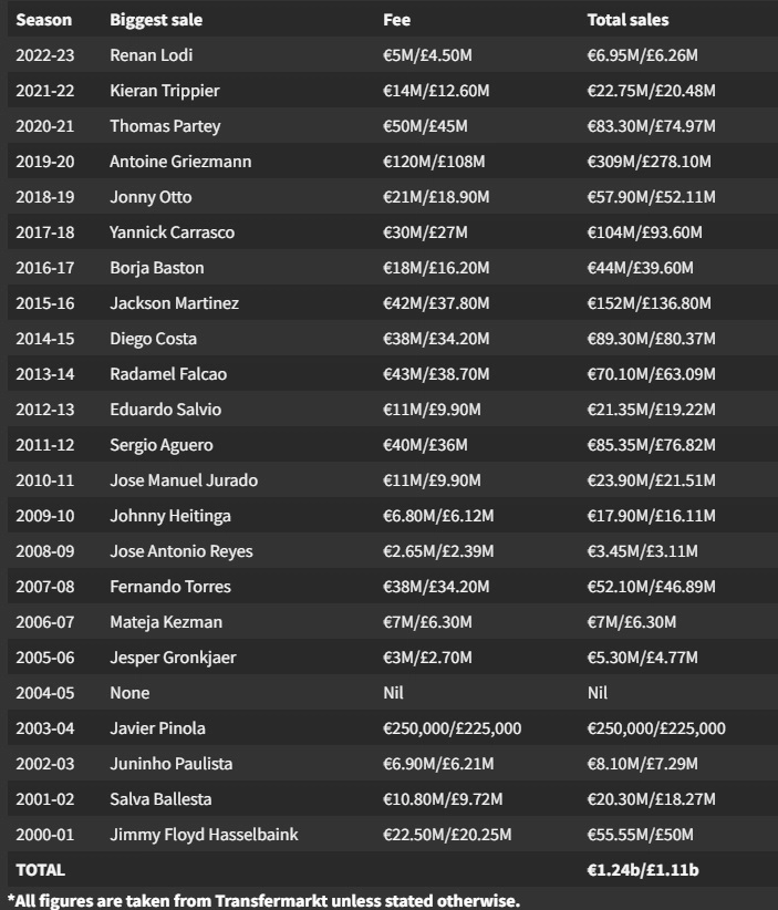 Από το 2000 μέχρι σήμερα η Ατλέτικο Μαδρίτης έχει βάλει στα ταμεία της πάνω από 1 δισ. ευρώ μέσω πωλήσεων.
