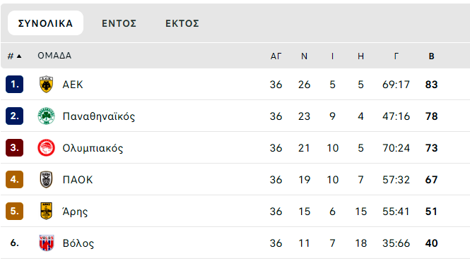 Τέλος, ο Ολυμπιακός πανηγύρισε μεγάλο διπλό στην Τούμπα με 0-1 και κατέκτησε την τρίτη θέση με 73 βαθμούς, αφήνοντας τον ΠΑΟΚ τέταρτο με 67 βαθμούς.