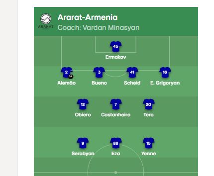 Η Αραράτ θα παίξει με 4-3-3 απέναντι στον Άρη. Αναλυτικά, οι 11 παίκτες των Αρμένιων: Ερμάκοφ, Γκριγκοριάν, Αλεμάο, Μπουένο, Σέιντ, Καστανέιρα, Τέρα, Ομπιέρο, Γιένε, Σερομπιάν, Έζα.