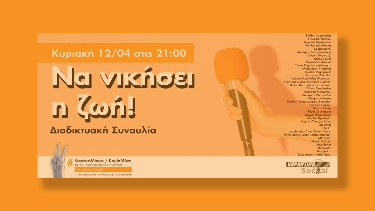 Στο πλαίσιο της προσπάθειας να μένουμε όλοι σπίτι και με σύνθημα «Να νικήσει η ζωή» και να μην μείνει κανείς μόνος/η, η ομάδα «Covid-19 Κανένας μόνος/Καμία μόνη» διοργανώνει αύριο στις 21:00 διαδικτυακή συναυλία.