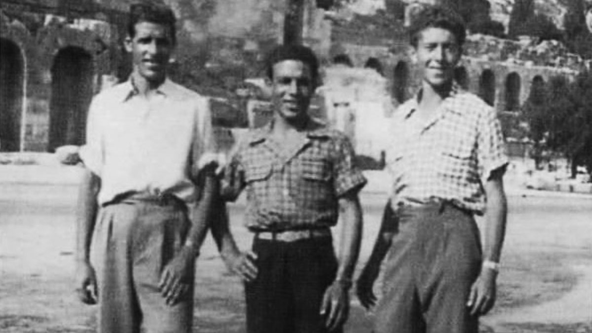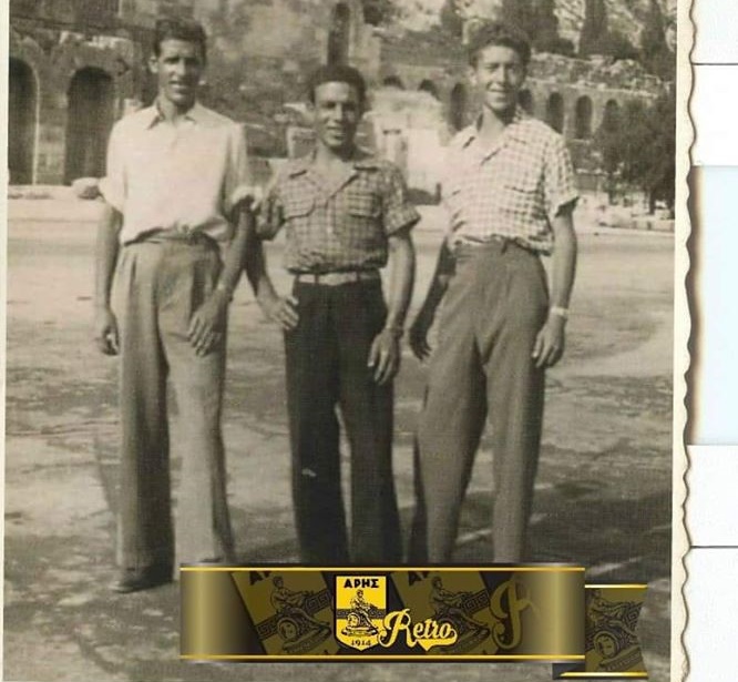 Στη φωτογραφία, ο Γιώργος Παπαβασιλείου (αριστερά) με τους συναθλητές του στον ΑΡΗ, Σόλωνα Υψηλάντη (στο μέσο) και Τάσο Αναστασίου (δεξιά) κατά την διάρκεια Πανελληνίων Αγώνων στην Αθήνα.