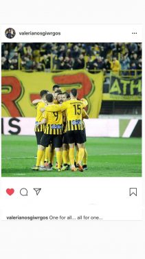 Ο διεθνής αμυντικός μετά την λήξη του αγώνα με τον Απόλλων Σμύρνης ανάρτησε στον προσωπικό του λογαριασμό στο Instagram στιγμιότυπο της αναμέτρησης όπου όλοι οι παίκτες αγκαλιάζονται γράφοντας “Όλοι για έναν…και ένας για όλους”