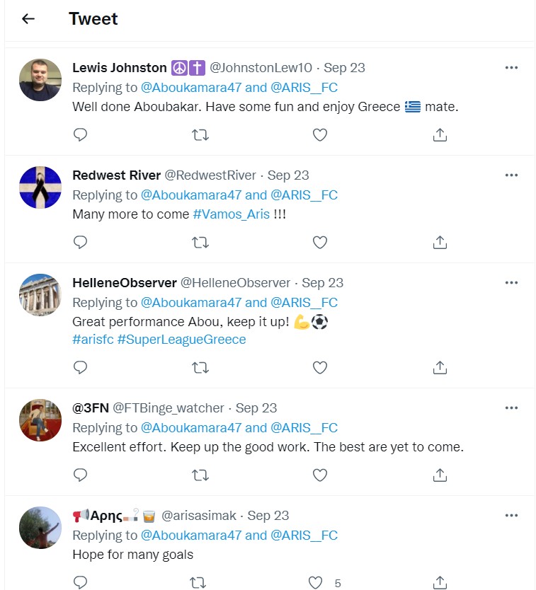 Μετά το παιχνίδι με τον Παναθηναικό ο Καμαρά έκανε μία ανάρτηση στα social media και ιδιαίτερα εκείνη στο twitter κέντρισε το ενδιαφέρον των Άγγλων ακολούθων του, στην οποία του έδωσαν συγχαρητήρια και του ευχήθηκαν ακόμη περισσότερα γκολ.