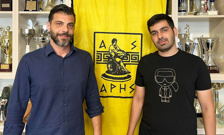 *Στη φωτό, το νέο απόκτημα του ΑΡΗ (αριστερά) με τον τιμ μάνατζερ της ομάδας Βόλεϊ Ανδρών, Χρήστο Μαλτά.
