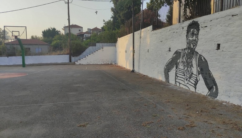 Στο χωριό Λαύκο του Νότιου Πηλίου και σε ένα γήπεδο ασφάλτου, ο Στέργιος δημιούργησε ένα γκράφιτυ που απεικονίζει τον MVP του NBA, Γιάννη Αντετοκούνμπο.