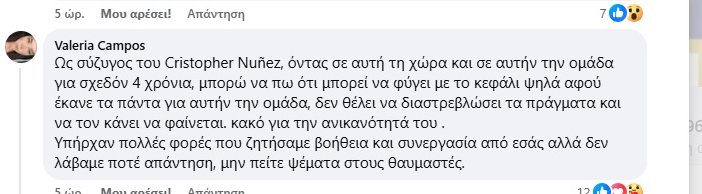 Κάτω από τη δημοσίευση της Λαμίας σχολίασε και η γυναίκα του Νούνιες, Βαλέρια Κάμπος η οποία στα ελληνικά τόνισε πως ο παίκτης φεύγει από την Ελλάδα με το χέρι ψηλά, ενώ είπε πως πολλές φορές ζήτησαν βοήθεια από τους διοικούντες την ΠΑΕ χωρίς, όμως, να παίρνουν ποτέ απάντηση.