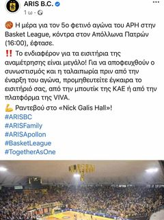 Tο δικό της μήνυμα για την σημερινή αναμέτρηση κόντρα στον Απόλλωνα Πατρών έστειλε στον κόσμο της ομάδας η ΚΑΕ Άρης τονίζοντας παράλληλα την αναγκαιότητας της έγκαιρης προσέλευσης στο γήπεδο.