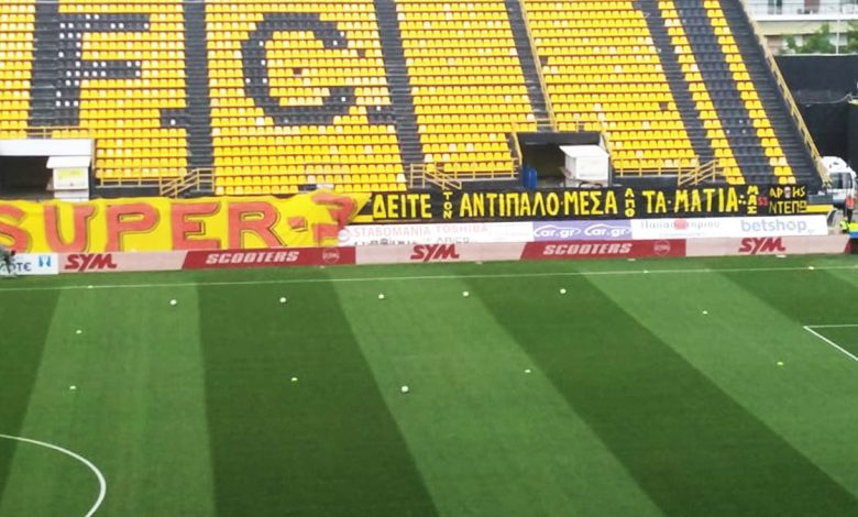 Μπορεί ο κόσμος του Άρη να βρίσκεται εκτός γηπέδου για τον σημερινό κρίσιμο αγώνα της ομάδας, ωστόσο στις κερκίδες του Χαριλάου δεσπόζουν πανό με μηνύματα εμψύχωσης με το «Δείτε τον αντίπαλο μέσα από τα μάτια μας» να ξεχωρίζει.