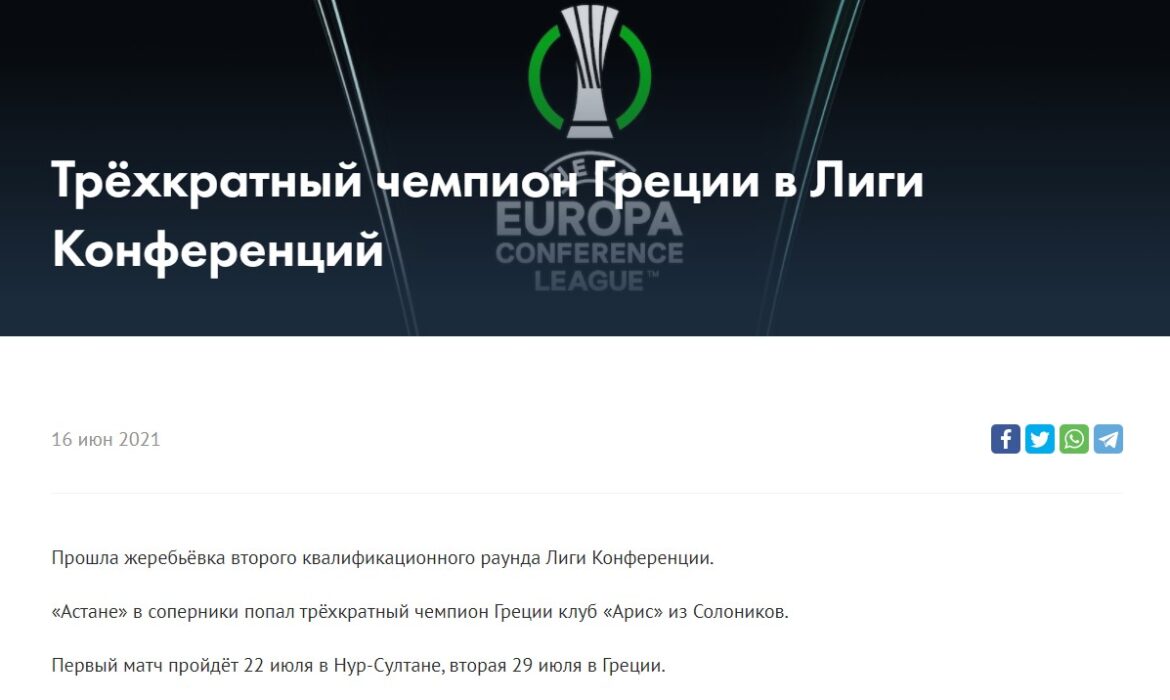 Συγκεκριμένα, οι Καζάκοι, αναφέρθηκαν στην κατάκτηση τριών πρωταθλημάτων από τους Θεσσαλονικείς στην Ελλάδας, λέγοντας:“Διεξήχθη σήμερα η κλήρωση για τον Β’ προκριματικό γύρο του Europa Conference League. Ο αντίπαλος της Αστάνα είναι τρεις φορές πρωταθλητής Ελλάδας και ονομάζεται Άρης Θεσσαλονίκης.”