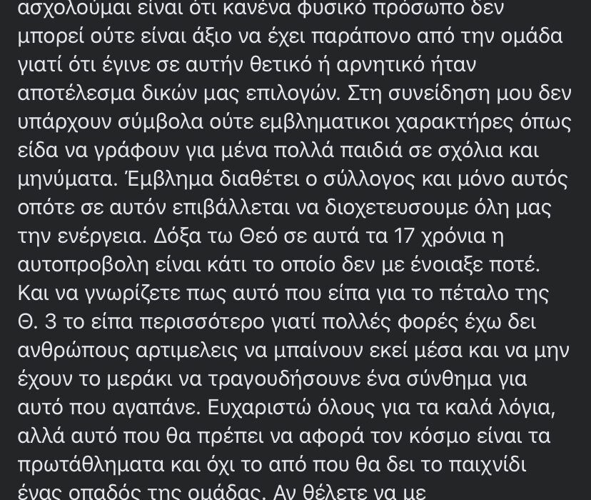 Στη συνείδηση μου δεν υπάρχουν σύμβολα ούτε εμβληματικοι χαρακτήρες όπως είδα να γράφουν για μένα πολλά παιδιά σε σχόλια και μηνύματα. Έμβλημα διαθέτει ο σύλλογος και μόνο αυτός οπότε σε αυτόν επιβάλλεται να διοχετευσουμε όλη μας την ενέργεια. Δόξα τω Θεό σε αυτά τα 17 χρόνια η αυτοπροβολη είναι κάτι το οποίο δεν με ένοιαξε ποτέ. Και να γνωρίζετε πως αυτό που είπα για το πέταλο της Θ. 3 το είπα περισσότερο γιατί πολλές φορές έχω δει ανθρώπους αρτιμελεις να μπαίνουν εκεί μέσα και να μην έχουν το μεράκι να τραγουδήσουνε ένα σύνθημα για αυτό που αγαπάνε.