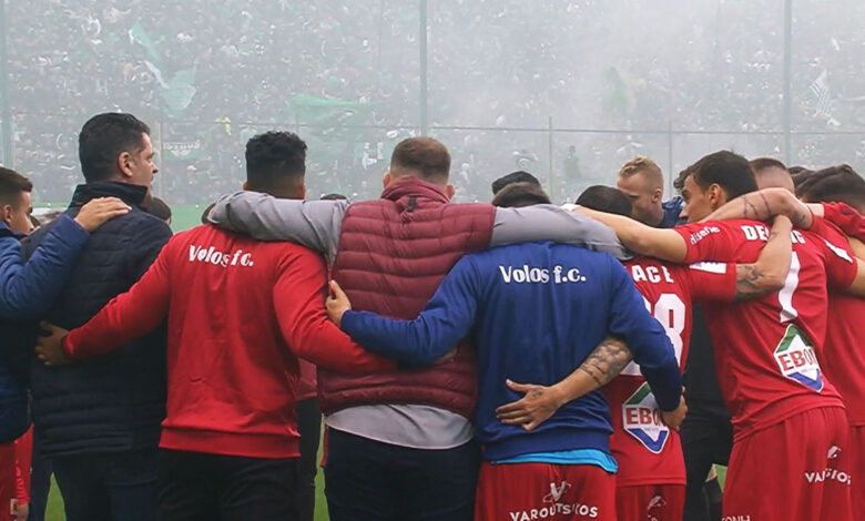 Οι ποδοσφαιριστές του Βόλου στην έναρξη της αναμέτρησης με τον Παναθηναϊκό, συγκεντρώθηκαν μπροστά από τον πάγκο τους ως ένδειξη διαμαρτυρίας για τον μη ορισμό ξένων διαιτητών στα παιχνίδια τους.