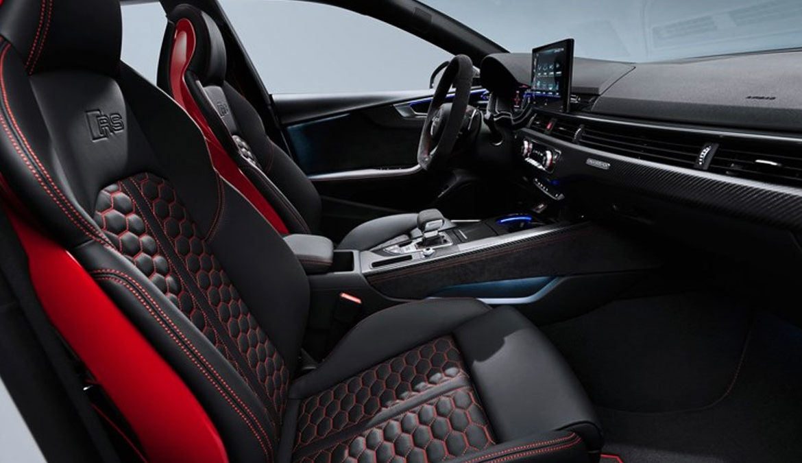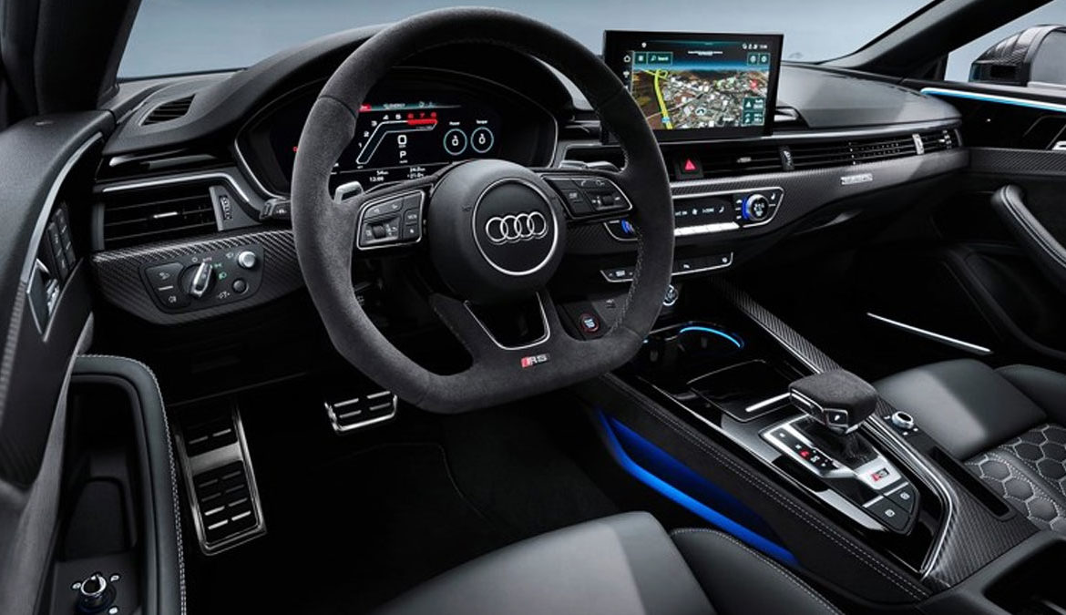 Στο εσωτερικό ξεχωρίζουν τα σπορ καθίσματα RS με επένδυση Alcantara και δέρμα, οι κόκκινες ή γκρι ραφές στις επιφάνειες, η μεγάλη οθόνη αφής MMI 10,1 ιντσών, το virtual cockpit plus των 12,3 ιντσών και το τριάκτινο τιμόνι με την παχιά στεφάνη επίσης από Alcantara.