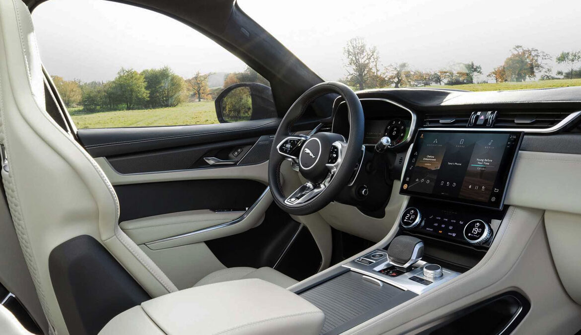 Στο εσωτερικό η F-Pace SVR απέκτησε το ανασχεδιασμένο ταμπλό της υπόλοιπης γκάμας F-Pace με μεγαλύτερη κυρτή οθόνη αφής 11,4″ που φιλοξενεί το σύστημα ενημέρωσης και ψυχαγωγίας Pivi Pro και τον ψηφιακό πίνακα οργάνων 12,3″.