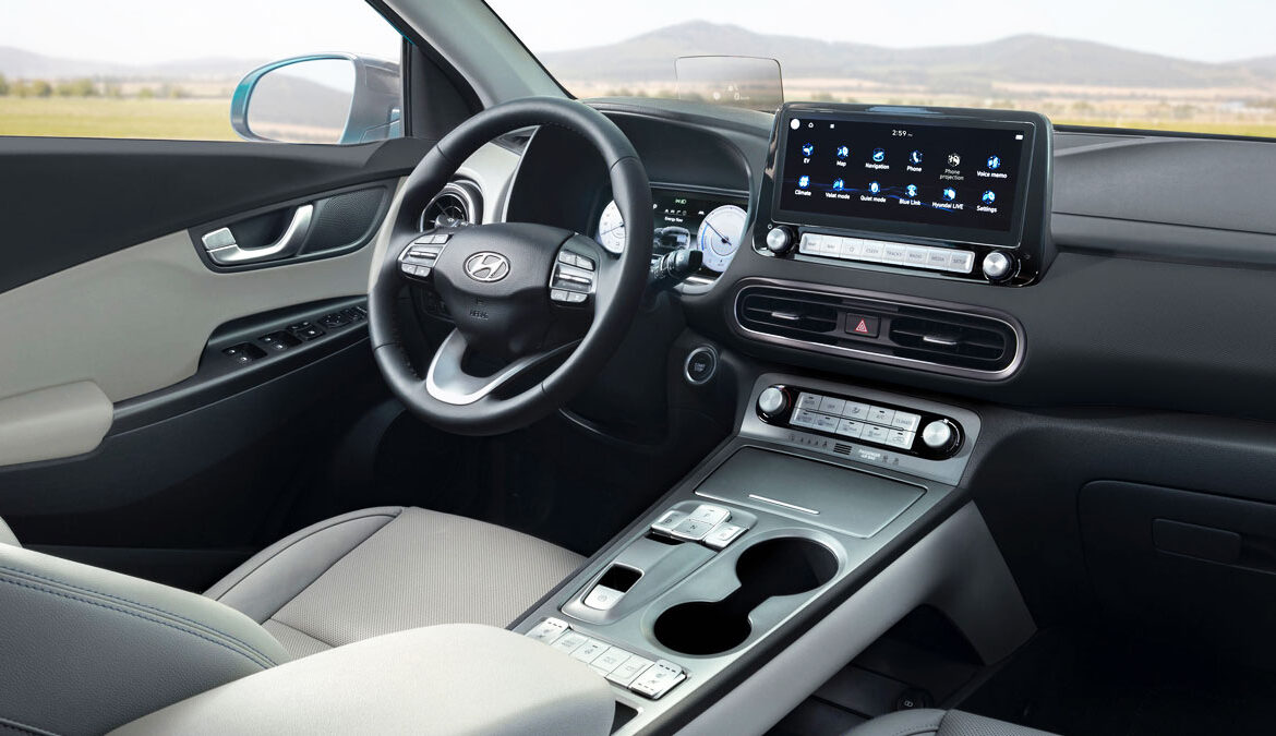 Στο εσωτερικό, το Kona Electric απέκτησε νέο ψηφιακό πίνακα οργάνων 10,25″ και προαιρετική κεντρική οθόνη αφής 10,25″ (στάνταρ οθόνη αφής 8″) που ενσωματώνει το αναβαθμισμένο σύστημα ενημέρωσης και ψυχαγωγίας τηα Hyundai με όλες τις σύγχρονες επιλογές συνδεσιμότητας και δυνατότητα απομακρυσμένου ελέγχου από smartphone.