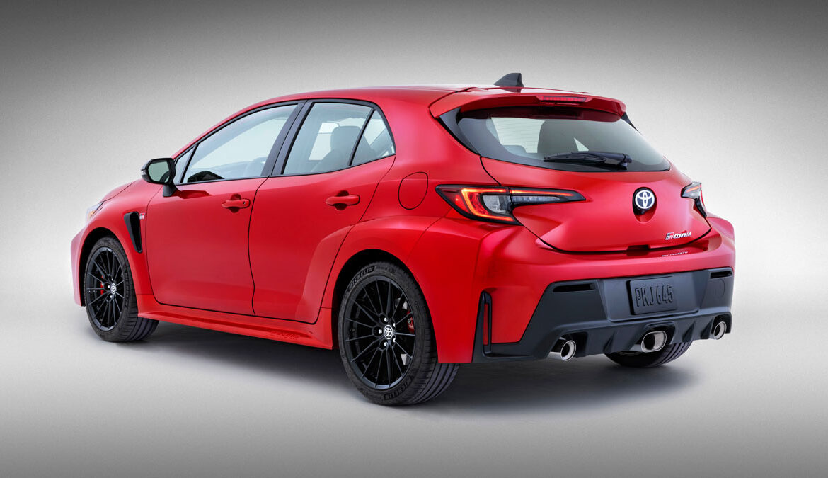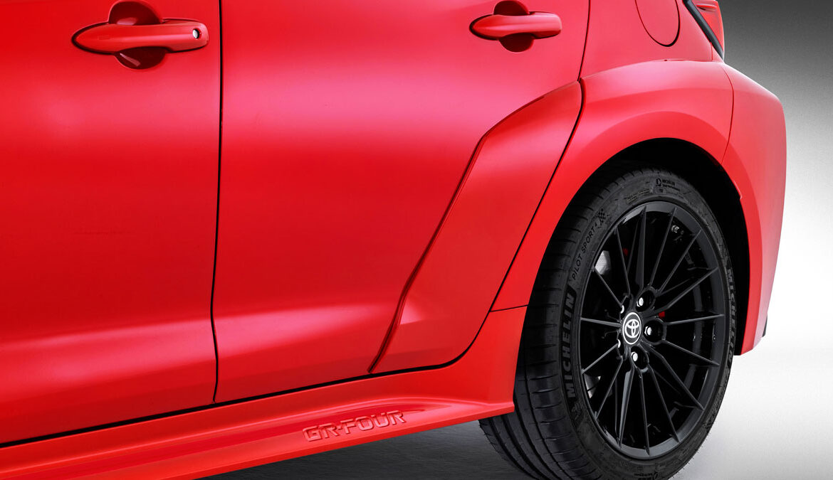 Όπως θα περίμενε κανείς, οι αλλαγές στην GR Corolla συγκριτικά με το συμβατικό μοντέλο δεν περιορίζονται κάτω από το καπό. Εξωτερικά, η βασική έκδοση Core διαθέτει πιο επιθετική γρίλια και προφυλακτήρα εμπρός, φουσκωμένους θόλους τροχών και μαρσπιέ με την επιγραφή GR-Four. Πίσω, ξεχωρίζει ο διαχύτης ο οποίος φιλοξενεί την τριπλή απόληξη εξάτμισης.