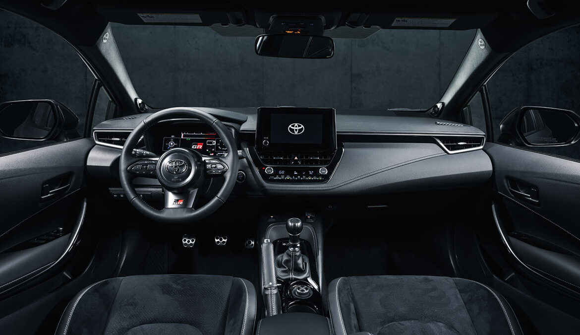 Περνώντας στο εσωτερικό, στον πίνακα οργάνων υπάρχει πλέον μια οθόνη 12,3″, ενώ στο κέντρο του ταμπλό δεσπόζει η οθόνη αφής 8″ του συστήματος infotainment. Επίσης, η GR Corolla έρχεται με σπορ καθίσματα με τον λογότυπο GR, δερμάτινο σπορ τιμόνι και πεντάλ από αλουμίνιο.