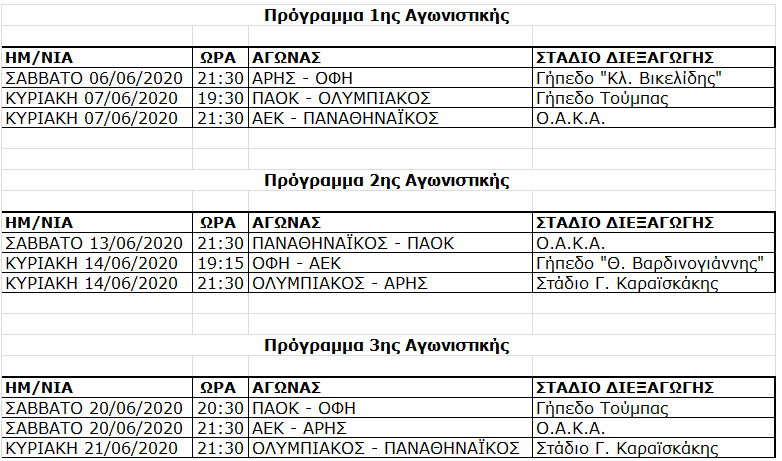 Ακόμη έγιναν γνωστές οι ώρες και της 2ης και 3ης αγωνιστικής, όπου ο Άρης θα αντιμετωπίσει στις 14/6 εκτός έδρας των Ολυμπιακό στις 21:30 ενώ την τέταρτη αγωνιστική οι κιτρινόμαυροι φιλοξενούνται από την ΑΕΚ στις 20/6, και πάλι 21:30.