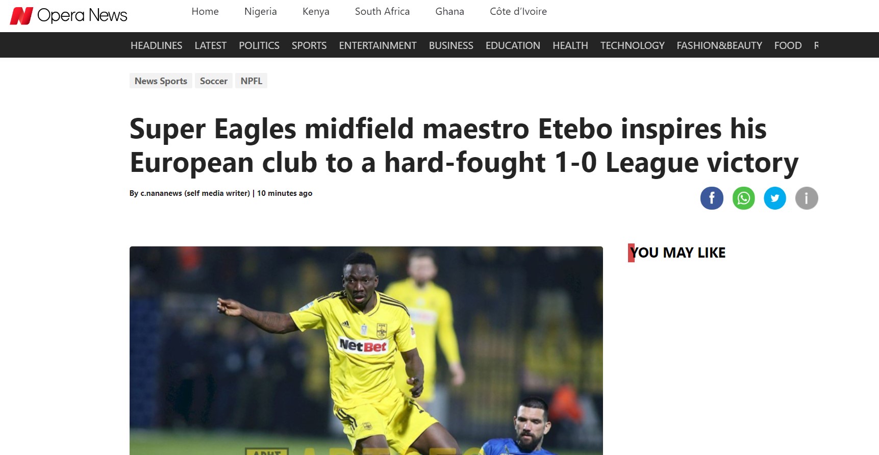 Ο τίτλος του ρεπορτάζ είναι: «Ο μαέστρος της μεσαίας γραμμής των Σούπερ Αετών(σ.σ. Νιγηρίας), Ετέμπο, εμπνέει την ευρωπαϊκή του ομάδα για μια δύσκολη νίκη στο πρωτάθλημα με 1-0», ενώ μέσα στο κείμενο τονίζονται μεταξύ άλλων: