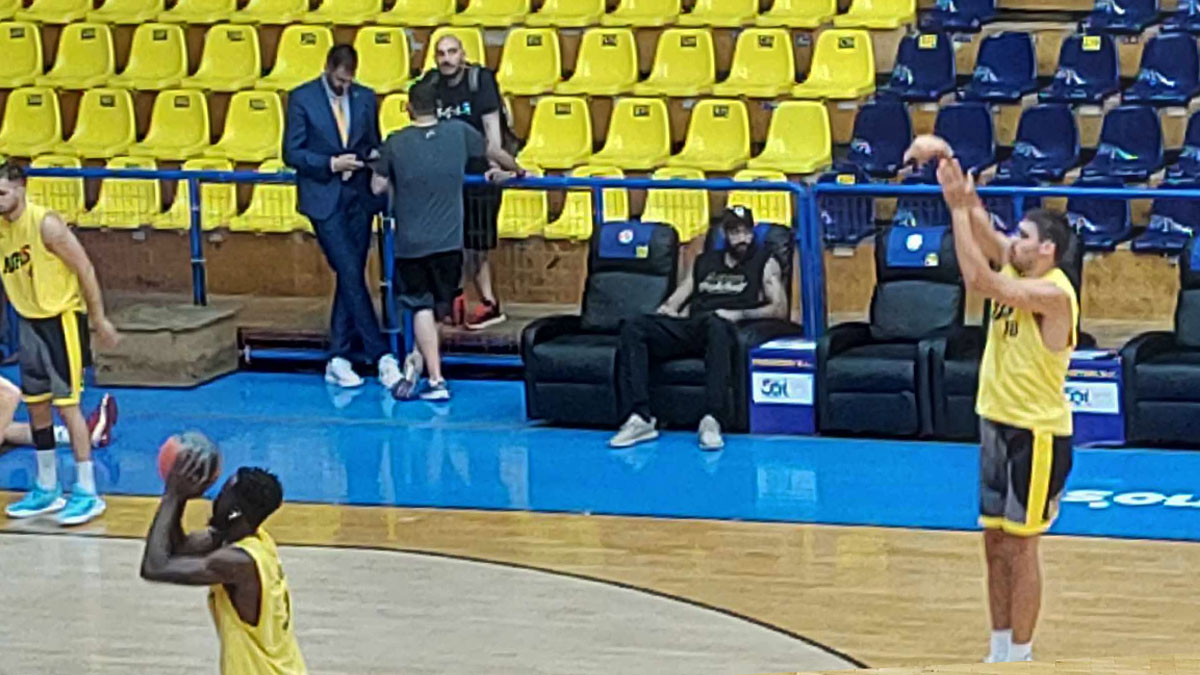 Ο Άρης πραγματοποιεί το καθιερωμενό του ζέσταμα στο «Ανδρέας Παπανδρέου», με τον Ρόνι Χάρελ, που ταξίδεψε μαζί με την αποστολή να παρακολουθεί τους συμπαίκτες του.