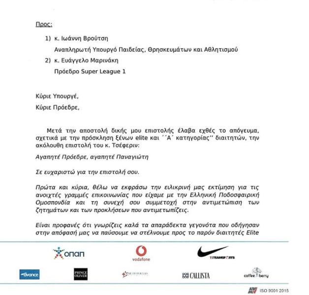 Η Ομοσπονδία δημοσίευσε μέσω της ιστοσελίδα της την επιστολή του προέδρου της UEFA, την οποία μάλιστα έχει κοινοποιήσει στον υφυπουργό αθλητισμού, Ιωάννη Βρούτση, αλλά και στον πρόεδρο της Stoiximan Super League, Βαγγέλη Μαρινάκη.
