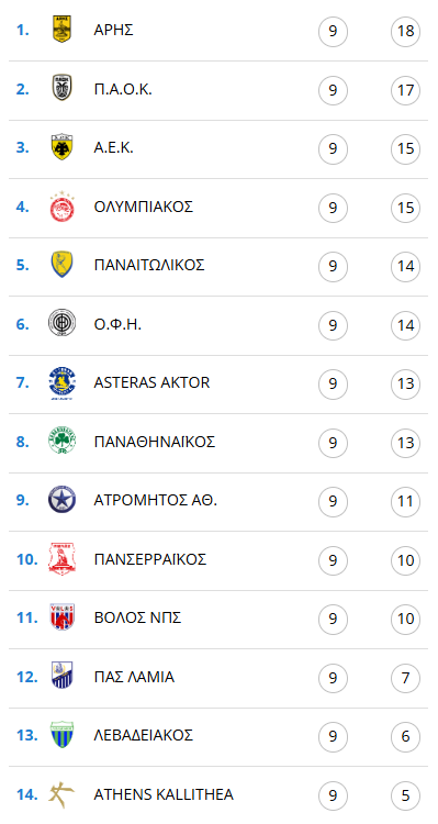 Ο Άρης βρίσκεται μετά το πέρας της 9ης αγωνιστικής στη πρώτη θέση του βαθμολογικού πίνακα με 18 βαθμούς