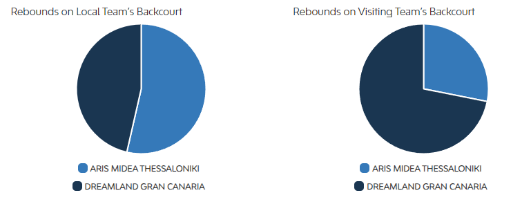Οι Ισπανοί είχαν ποσοστό 46% στα επιθετικά ριμπάουντ, τη στιγμή που ο Άρης από την πλευρά του είχε ποσοστό 28% στην ίδια κατηγορία, με αυτό να αποτυπώνεται και στα παρακάτω γραφήματα.