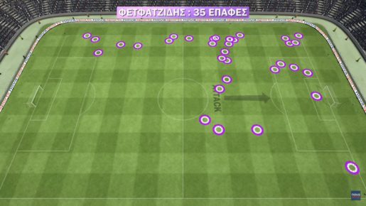 Ο Έλληνας μεσοεπιθετικός τελείωσε τον αγώνα με 2 ασίστ και ένα γκολ, ενώ είναι πρώτος στην κατηγορία των ασίστ στη Superleague 1 (3). Ωστόσο, όπως φαίνεται και στις φωτογραφίες από τη NOVA η εμφάνιση του Φετφατζίδη δεν περιορίζεται εκεί. Ήταν ο πιο δημιουργικός παίχτης των Κιτρίνων, έχοντας 35 επαφές με τη μπάλα, περισσότερες από κάθε συμπαίχτη του. Ενδιαφέρον επίσης προκαλούν οι περιοχές στις οποίες κινήθηκε ο παίχτης του Άρη.