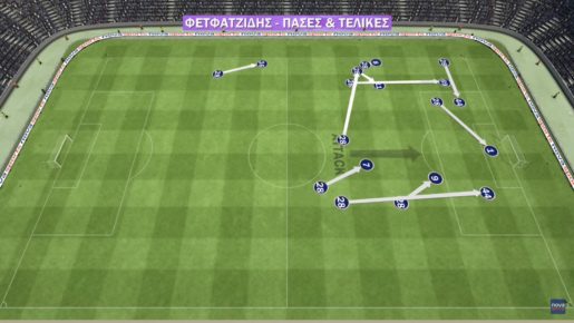 Παράλληλα, η παρακάτω φωτογραφία αποτυπώνει τις πάσες και τελικές που “έβγαλε” ο Φετφατζίδης απέναντι στον Παναθηναικό. Φαίνεται ότι ο 28χρονος βρέθηκε σε πολλά και διαφορετικά σημεία του γηπέδου ενώ είχε συνεργασίες με αρκετούς συμπαίχτες του.