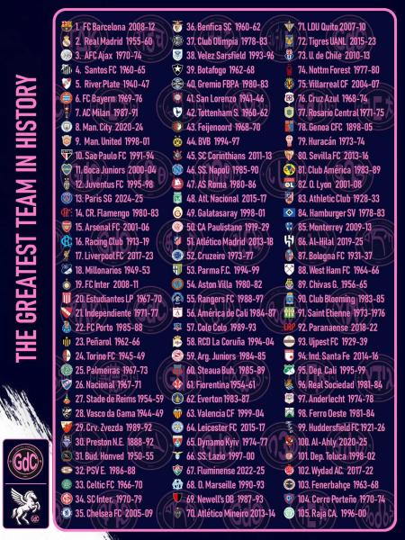 Την πεντάδα κλείνουν η Σάντος και η Σάντα Φε, ενώ στη δεκάδα βρίσκεται η Μάντσεστερ Σίτι από το 2020 έως το 2024.