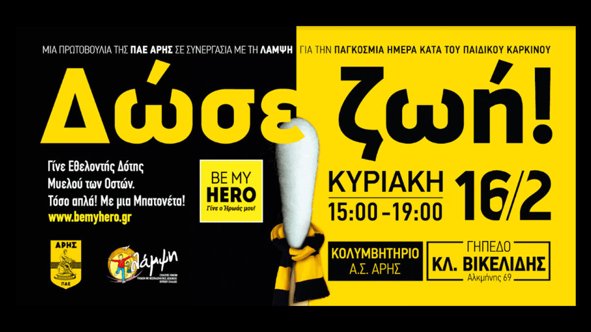 Η ΠΑΕ Άρης συνεργάζεται με την Λάμψη και τον οργανισμό “Be my hero” για να εγγράψει εθελοντές-δότες μυελού των οστών, με όλο τον κόσμο να μπορεί να συμμετέχει, σε μία διαδικασία που δεν παίρνει πάνω από πέντε λεπτά.